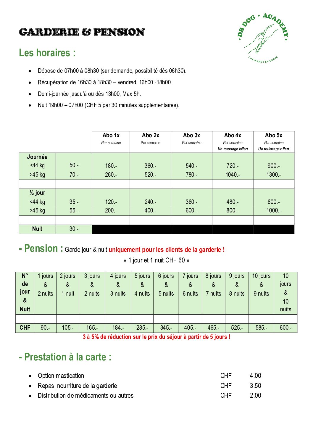 Pension – 1 nuit & 1 jour : 60 CHF (>45kg CHF 100)